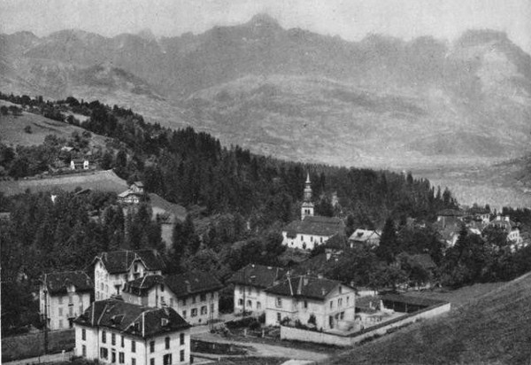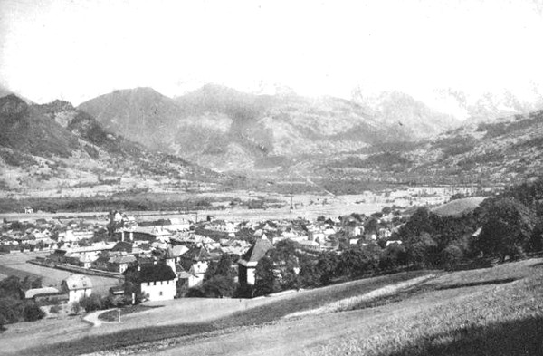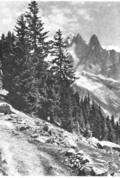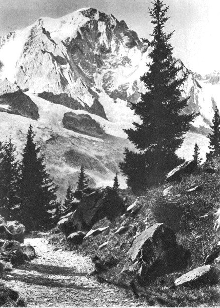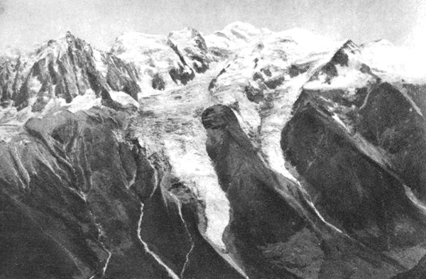 Sallanches est, avec le site délicieux de Combloux récemment aménagé par la Compagnie des chemins de fer P.L.M., un des points les plus favorables d'où l'on puisse embrasser le massif du Mont-Blanc dans son ensemble. La cime [Pg 17] apparaît encadrée par les gigantesques sommets qui lui font un merveilleux cortège. A gauche, c'est l'entassement prodigieux des Aiguilles proprement dites; à droite se succèdent, harmonieusement espacés, les sommets plus majestueux du Dôme et de l'Aiguille du Goûter, les Aiguilles de Bionnassay, de Miage et de Trelatête.