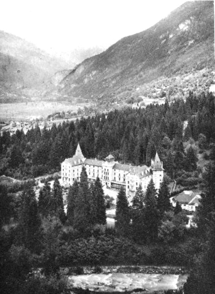 Mais l'apparition n'est que de courte durée; aussitôt Sallanches quittée, à mesure qu'on s'avance dans la direction de Saint-Gervais, le Mont-Blanc rentre sous terre. Du Fayet, il n'est pas visible: la vue se heurte à la chaîne du Reposoir, aux à pics de l'Aiguille de Varens et du désert de Platé. Cependant, fait observer Charles Durier, «la pitoyable nature a prodigué des dédommagements au Fayet-Saint-Gervais». Trois sources d'eaux thermales, qui sourdent dans la gorge du Bas-Nant, attirent les valétudinaires. Un climat plus doux que celui de Chamonix, [Pg 18] y rend le séjour particulièrement agréable, à ceux qui supportent mal l'air rude de la montagne et ses environs offrent au touriste une diversité très remarquable de promenades délicieuses. C'est le lieu de prédilection des promeneurs, où s'attardent indéfiniment dans les douceurs d'une vie facile et luxueuse, ceux qui n'ont pas la hantise des monts et de la nature farouche.