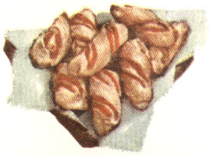 Form Stick Twists as directed at left. Wind strip of dough around roasted frankfurter or fried pork sausage, stretching to cover completely. Finish same as for Stick Twists.