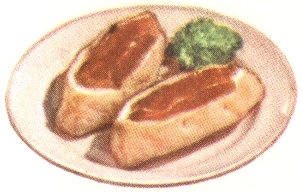 Mix thoroughly 2 cups Bisquick, ½ cup milk or water, ¼ cup melted shortening or drippings. If batter is too soft, add Bisquick. Divide into 8 pieces. Pat out to make 5” square. Place slice of cooked or canned meat on half of square. Spread with chili sauce or pickle relish. Fold dough over meat and seal edges with fork. Slit top. Bake 15 to 20 min. in hot oven.