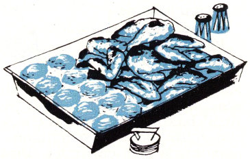 Different and delicious. (Pictured on inside of back cover.) Make Biscuit dough (p. 3). Roll into 10x6″ rectangle. Cut in half lengthwise. Cut each half into 12 strips. Melt ⅓ cup butter; pour half of it into 13x9½x2″ oblong pan. Place strips in pan. Pour remaining butter over tops. Bake.