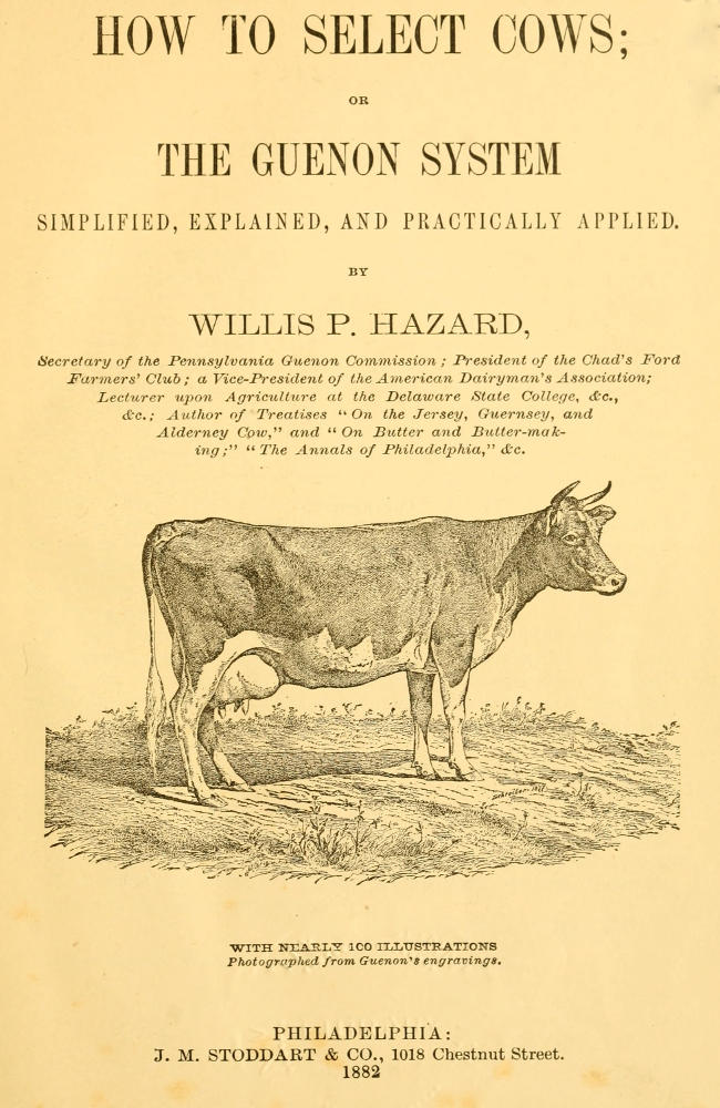 How to Select Cows; or, the Guenon System Explained. By Willis P. Hazard. In no way is the march of improvement in agriculture more decided than in the new discoveries and new methods of developing its resources. It is owing to these that America is now the granary of the world, and, as years roll by, if the developments of the next decade are as great in proportion as the last ones, no matter how extensive the foreign demand, there will be an ample supply at still lower prices than at the present. No branch of agricultural interests has changed so much and received such an impetus, especially within the last five years, as the dairy. Entire new modes of making butter and cheese and of setting milk have largely taken place of the old ones. Competition in making dairy products becomes keener each year, and every process by which the labor can be lessened, or the products be cheapened, meets with recompense.