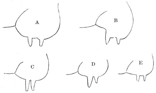 The escutcheon of the first order is the most developed; is also the best marked. The escutcheon of each of the five other orders is similar in form to that of the first order. It is, in some sort, only a proportionate reduction—a diminutive. It is the escutcheon of the first order, with the dimensions reduced or brought within less extended limits, reaching no longer the hock nor longer covering the interior of the thighs, nor yet reaching up to the vulva, remaining consequently at a distance greater or less from these boundaries.