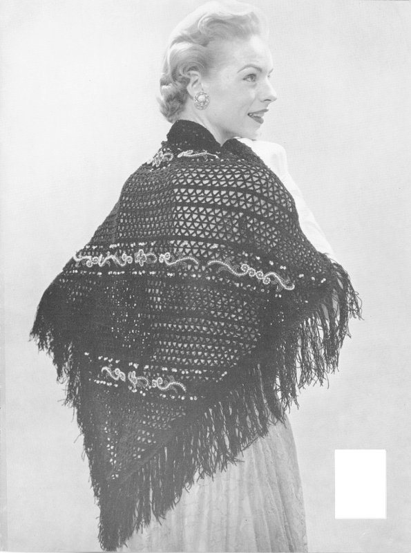 FINISHING: Line stole with taffeta. Sew on sequins as shown in photograph. Sew end fringe in place, catching between taffeta and stole.