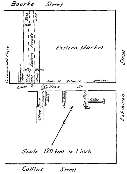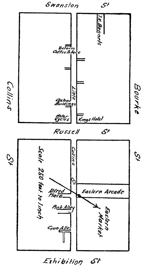 [Pg 13] This means that she was standing near a lodging-house kept by a witness named Ellis, in the delicensed premises which was formerly the Adam and Eve Hotel. It is on the corner of Little Collins Street and Alfred Place, Alfred Place being a rather pretentious right-of-way running through to Collins Street. Had she desired to go to her destination, which was the Masonic Chambers at the east end of Collins Street, she might have gone either along Alfred Place to Collins Street, or up Little Collins Street to Exhibition Street, and thence to Collins Street. According to Mrs. Young, the girl looked frightened, and she was seen to drop and pick up her parcel. The Youngs walked on down to Russell Street, which would take her two or three minutes, they said, and when they looked back the girl had disappeared. She might have still been standing in Alfred Place, or she could have returned to the Arcade, but they do not think she would have had time to have got to Exhibition Street. That is the last seen of the girl by any witness whose evidence is admitted by both sides to be credible. It should be noted that she was then within an easy 10 minutes’ walk of Bennet and Woolcock’s, and she had taken an hour and a quarter to cover the distance.