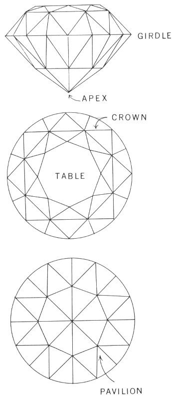 Characteristic of the standard brilliant cut are the 32 crown facets surrounding a relatively small, flat, table facet and the 24 pavilion facets and culet at the bottom of the stone.