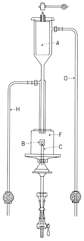 Sketch of a simple balance used to determine specific gravity of a gemstone. The operator places the gemstone in the upper pan (A), moves the weight (B) along the beam (C) until it balances perfectly, and notes the number at the weight’s position. He then transfers the gemstone to the lower pan (D), which is completely immersed in water, and moves the weight along the beam to restore balance. He notes the scale number at the new position and determines the specific gravity simply by dividing the first number by the difference between the two numbers. If the gemstone is large, the operator can use heavier sliding weights. (E).