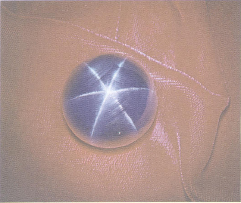 Asterism (star effect) is caused by parallel inclusions arranged in several directions related to the crystal structure of the gemstone. Two rays in the 175-carat, 6-rayed star garnet from Idaho (at left in photo) are weaker than the other four because of fewer inclusions in that direction. The 23-carat star orthoclase from Ceylon shows brightly all of its four possible rays. (Actual size.)