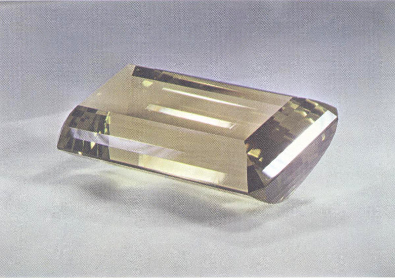 A 783-carat step-cut citrine of deep, rich color dwarfs a 278-carat brilliant-cut citrine (at left), a 90-carat smoky quartz, and a 91-carat briolette of citrine. The smoky quartz, from Switzerland, is so dark that it appears to be opaque. The other three stones came from Brazil. The briolette and brilliant-cut citrines were cut and donated to the Smithsonian Institution by Albert R. Cutter. (Slightly less than half actual size.)
