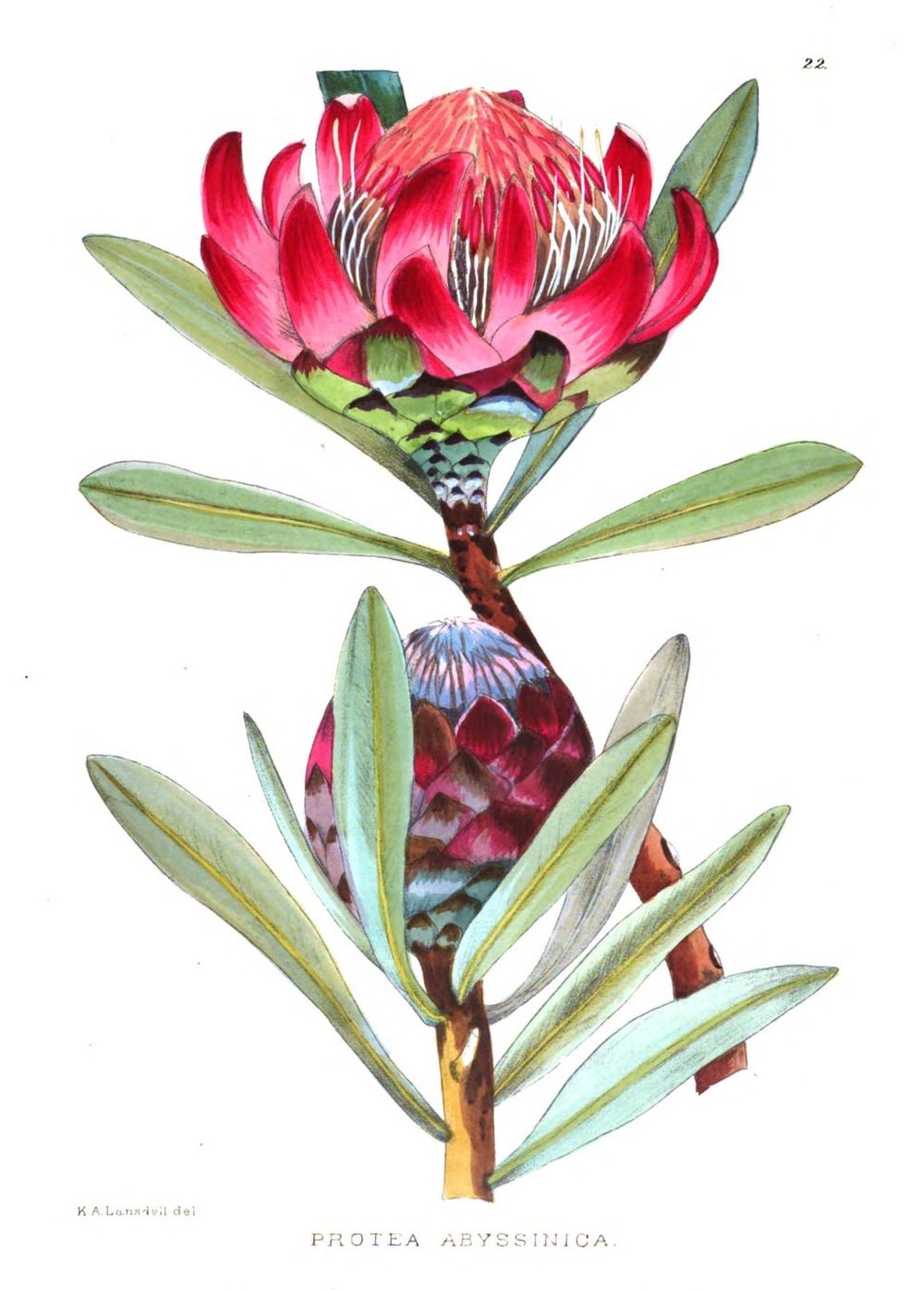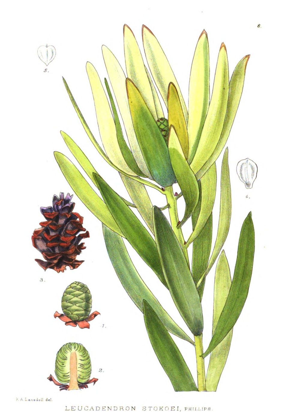 Description:—An erect shrub, 6-8 ft. high. Branches pilose with long hairs. Leaves 1-2¼ in. long, ¾-1¼ in. broad, slightly imbricate, obovate or oblanceolate-spathulate, with a very obtuse blackish apex, slightly narrowing at the base, or rarely the upper leaves attenuated, distinctly 5-6 nerved, rigidly sub-coriaceous, densely ciliate when young, otherwise glabrous or more or less scantily pilose. Heads sessile, 2-2½ in. long, many-flowered. Involucral bracts petaloid, 4-5-seriate, 1¾-2 in. long, 4-12 lin. broad, spathulate-oblong, rounded at the apex, many-nerved, membranous, pilose, ciliate, rose-red, the outermost densely shaggy-pilose. Perianth-tube 3 lin. long,{156} cylindric, pubescent; segments lemon-yellow, 1¼ in. long, linear, pilose; limb 4 lin. long, linear scantily pilose. Filaments swollen, fused with the perianth; anthers 3½ lin. long, linear, with an ovate obtuse apical gland ¼ lin. long. Hypogynous scales 5-6 lin. long, linear, obtuse, brown. Style 1¾ in. long, grooved, glabrous; stigma 3½ lin. long, grooved, obtuse; ovary 1 lin. long, globose. Fruit 3 lin. long, oblong, smooth and shining (ex. Flora Capensis).