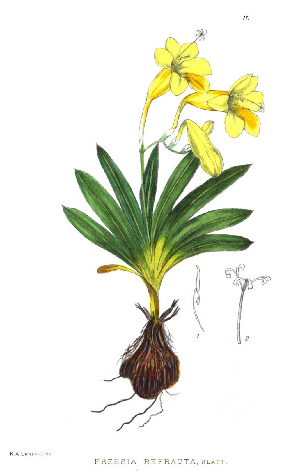 It was first discovered in the Transvaal by the collector Rehmann about 1878, and later by the Hon. R. Jameson on the mountains round Barberton. In 1889 it flowered at Kew Gardens and was illustrated in the Gardener’s Chronicle for that year. Shortly afterwards a coloured plate and description appeared in the Botanical Magazine (t. 7087). The specific name was proposed by the late Dr. Bolus, who himself collected the species at Barberton.