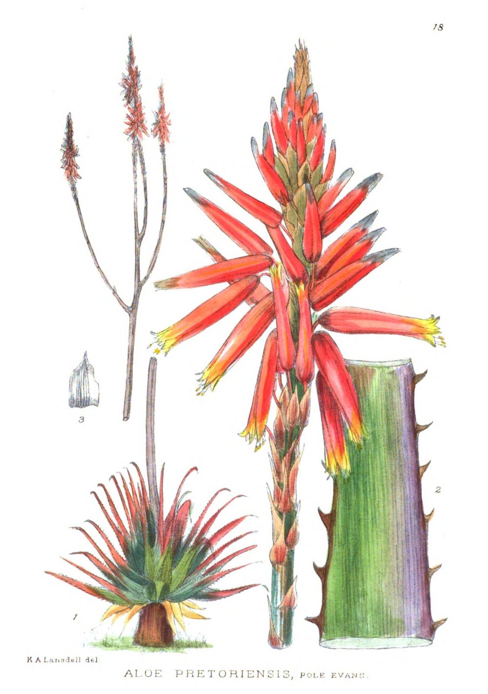 This remarkable Aloe was collected by Messrs. Wickens and Pienaar in M‘Phathlele’s Location in the Pietersburg District during January, 1914. Specimens brought to the Botanical Laboratories, Pretoria, flowered during July and August of the same year.