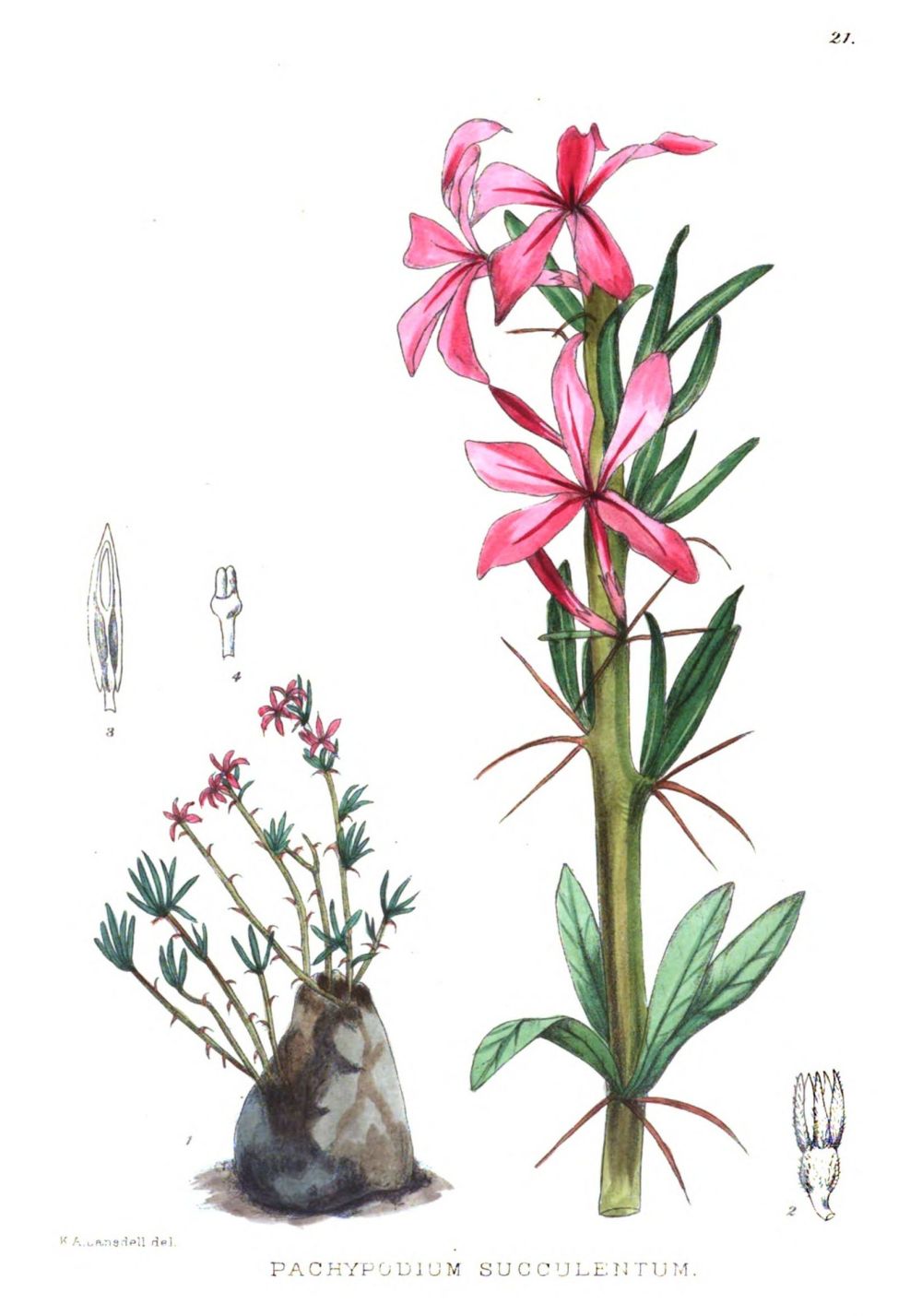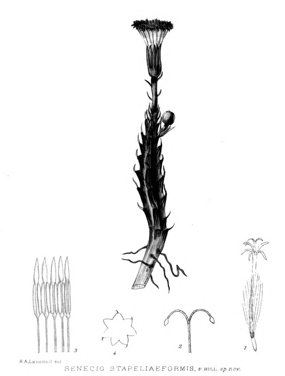 This remarkable plant, one of the so-called “Bushman’s Candles” or “Candle Bush,” flowered in the garden of the Division of Botany, Pretoria, in September, 1919. The specimens were collected by Major C. W. Lewis at Aus in South-West Africa. It is very closely allied to S. Burmanni Sweet.[D] We are indebted to the Director of the Royal Botanic Gardens, Kew, for the determination.