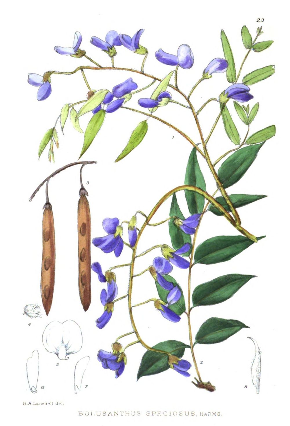 Description:—Rootstock short, tuberous, with fleshy cylindric roots. Leaves dark green, 6-10, basal, 20-60 cm. long, 2-4 cm. broad, strap-shaped, obtuse, glabrous. Peduncle O·25-1 metre high, terete, glabrous. Inflorescence a many-flowered umbel. Spathe-valves 2·5 cm. long, 2 cm. broad at the base, ovate, acuminate, withering in the mature inflorescence. Floral-bracts 2·7 cm. long, linear. Pedicels about 6 cm. long, terete, jointed at the apex. Flowers blue; perianth-tube 1·7 cm. long, 6 mm. in diameter; lobes 2-5 cm. long, 9 mm. broad, oblanceolate, obtuse. Stamens inserted at the throat of the perianth-tube; filaments 2·5-3 cm. long, arcuate; anthers oblong. Fruit a triquetrous capsule.