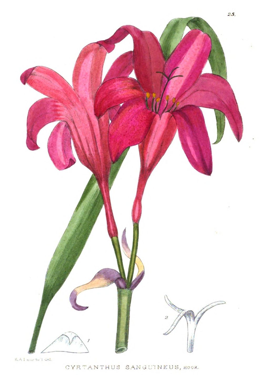 This beautiful Cyrtanthus was described by Aiton in 1789, probably from plants collected in South Africa by Masson, who sent specimens of this species to England in 1774. The fact that it has been so frequently figured is an indication that it has appealed largely to horticulturists. Jacquin first produced a coloured plate in 1797 and the last figure we know of in botanical literature is that quoted above.