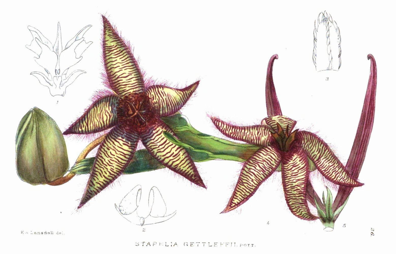 Description:—Rootstock a flattened tuber, 2·5 cm. in diameter. Stem twining, slender, glabrous. Leaves 1·2-2·5 cm. long, 5-8 mm. broad, linear or linear-oblong, somewhat fleshy, apiculate, glabrous, sometimes with a slight ciliation on the margins. Peduncles 1·5-2 cm. long, slender, with 2 small bracts about the middle, 1-3 flowered. Sepals subulate. Corolla-tube 2 cm. long, globose at the base, contracted into a funnel-shaped tube much dilated at the throat; lobes united into an umbrella-shaped canopy supported on claws about 5 mm. long. Outer-corona about 1 mm. long, of 5 small pocket-like lobes, truncate at the top or rising into a minute deltoid point at the dorsal angle, inner coronal-lobes about 1 mm. long, falcate, recurved. Follicles about 10 cm. long, 3 mm. in diameter, terete, tapering from about the middle to a slightly{160} dilated apex, glabrous, greenish or irregularly striped with rupple-red.