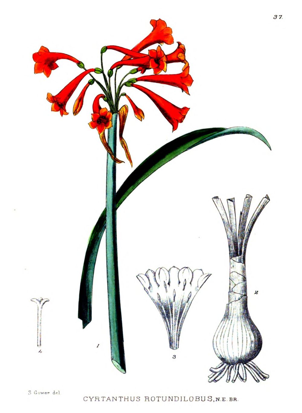 Cyrtanthus rotundilobus; Bulbus ovoideus, 3 cm. diametro, in collo productus. Folia 4, erecto-recurva, 16-30 cm. longa, 1·7 cm. lata, lineari-lanceolata, apice attenuata, subtus carinata, glabra. Pedunculus circa 14 cm. longus, teres, solidus, glaber. Umbella 9-11-flora. Bracteæ 2·5 cm. longae, ovatæ acuminatae. Pedicelli 1·7 cm. longi, teretes, glabri. Perianthium plus minusve nutans rubro-cinnabarinum; tubus 2·5 cm. longus, infundibularis, ad apicem 8-9 mm. diametro; lobi circa 7 mm. longi et 5 mm. lati, elliptici vel suborbiculari, minute apiculati. Stamina ad faucem perianthii inserta, biseriata, superioria subexserta; antherae 4 mm. longae. Ovarium 4 mm. longum, ellipsoideum; stylus 2·2 cm. longus, filiformis, stigmatibus tribus minutis.—N. E. Brown.