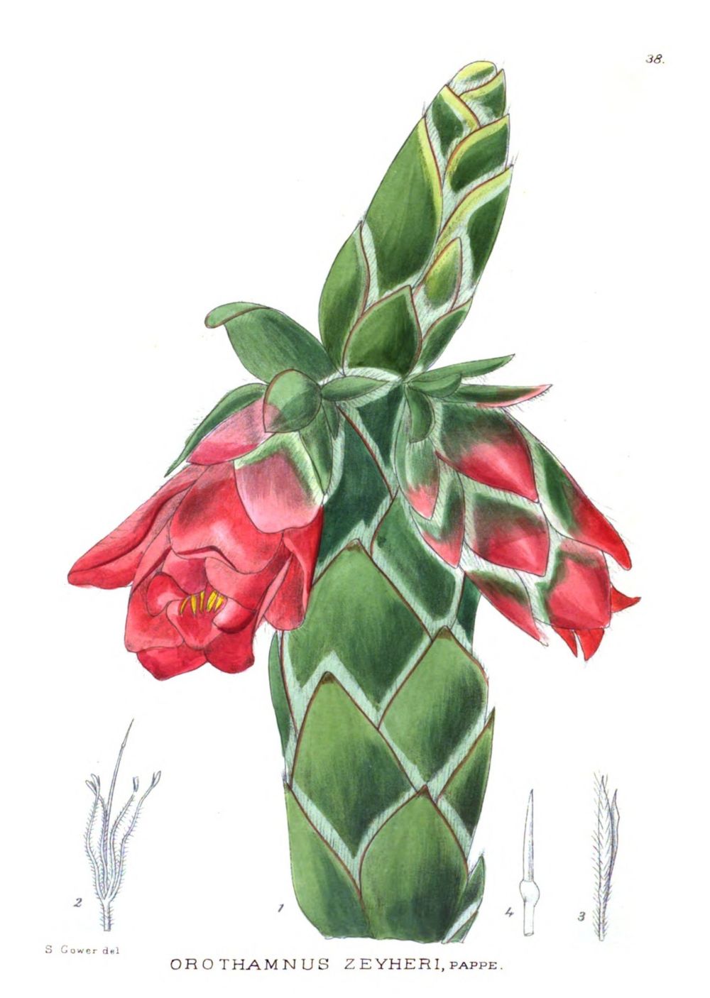 This species is another rara avis of the Cape Flora. It was figured for the first time in 1848 (Botanical Magazine t. 4357) from a painting sent by Dr. Pappe to Kew. Carl Zeyher discovered the species on the Hottentots Holland Mountains, and for very many years afterwards it remained unknown to botanists in the fresh state. Mr. E. J. Steer, of Cape Town, some years ago purchased specimens from a coloured flower-seller and photographed it, and this year (1920) it was met with more than once exposed for sale among the wild flowers in Adderley Street, Cape Town. Every effort of botanical collectors to discover the locality in which the species grows has up to now proved unsuccessful, and no information can be obtained from the coloured flower-pickers. The plant has no local name as far as we have been able to ascertain, and we propose the name “Zeyher’s Orothamnus” for this species.