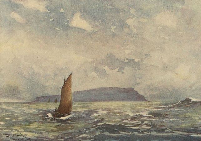 Off Stromness lies Hoy, an island containing the cream of Orkney scenery. On the north-west side the cliffs are higher than any of our mainland, and beside them rises the Old Man of Hoy, now on his last leg, but he once had two to prop up “the grandest natural obelisk in the British Isles.” The difficulty is to get a view of these giant rocks by leave of the rushing tideways and the squally winds. I have seen them only from their edge, yet might as well have been in Cheapside, when such a heavy drifting mist came on that I was glad to grope my way down, steering cautiously by half-obscured knolls, as shown on the Ordnance Map. The clearest sight I saw was the abashment of an English tourist, who suddenly emerged from the fog sans culotte, with fluttering shirt tails, wearing his most indispensable garment over his arm, perhaps from some mental confusion between Arcadian and Orcadian customs, or he had reckoned on meeting no one more modest than that Old Man of Hoy. Sights more safely visited are the Dwarfie Stone, the glen of Berriedale, the Kaim of Hoy, whose rock profile gratefully presents a silhouette of Sir Walter Scott, and the Enchanted Carbuncle seen by faithful eyes sparkling on the side of the Ward Hill. This is the highest point of the islands (1556 feet), from whose top, on a fine day, one has them spread out on the sea [210]like a toy map, and can count their lower Ward Hills that once gave alarms of the approach of a foe.