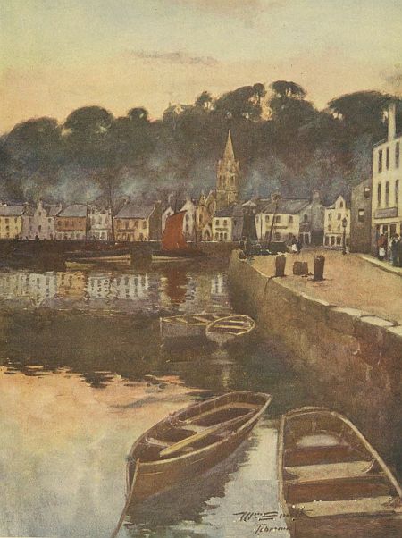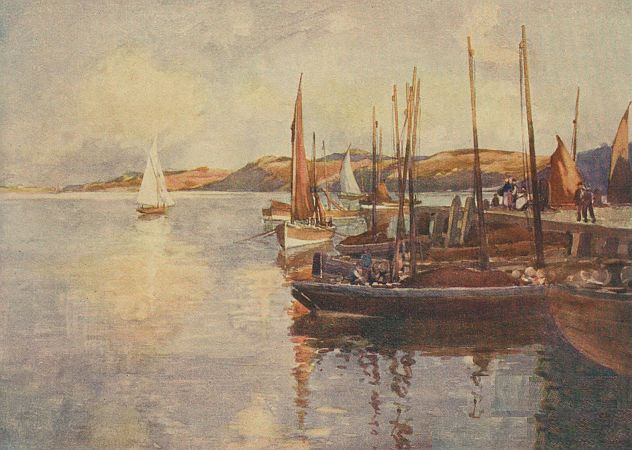 For the first stage of this voyage, indeed, the shore is too much masked by a long line of bathing and boating resorts, to which Glasgow folk love to escape even from the comforts of the Saltmarket. On the right-hand side stands Dunoon, whose fragment of ruined fortress looks stranded above a flood of hotels, shops, and villas, in which several villages have run together into a town. Farther down, on the Isle of Bute, Rothesay makes the focus of Clyde pleasure trips, no mushroom resort, but seat of an ancient royal castle that titled the heir of Scotland. The Stuarts still flourish here in the person of the Marquis of Bute, who is as great a man in the Principality of Wales as in the Dukedom of Rothesay. The old town has expanded into a couple of miles of esplanade, curving below green hills upon a land-locked bay, its surface lively with yachts, pleasure boats, and steamers that in the summer season turn out myriads of excursionists to [7]sack the joys of the place. I was about to belittle Rothesay by calling it the Southend of Glasgow; but in view of its hydros, its mineral spring, and its background of dwarf Highland scenery, its character may better be expressed in terms of chemical analysis: