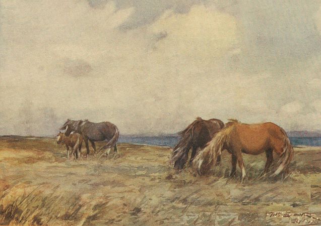 One might here fill pages by quoting from enthusiastic ornithologists, and telling exploits of the daring cragsmen who have exterminated or thinned out some of the nobler fowl; but I have so much to say about man that I must leave beast and bird out of view. The Shetlanders are born fishermen, a craft that calls for no small courage in these latitudes. It is only at odd times they turn to their rugged and thin soil, whose most outstanding production seems the small Sheltie ponies, in great demand for use in southern collieries. Sir M. Grant Duff tells of one brought to the mainland, that it had to learn what oats were good for. As for the hungry sheep, a Midland squire I knew once transported a flock of them to England, where they forthwith fell to cropping their way through the hedges in which they found unwontedly toothsome pasture. Even domestic animals may show a touch of the sea, for seals are some[213]times tamed as family pets. Otters are the Shetlands’ amphibious beasts of prey. The great game here is the “Ca’in’ whales,” now and then a sperm whale, that sometimes blunder into narrow voes, to be assailed with a general hue-and-cry of every soul that can get near them, as described in the Pirate, and in Mr. D. Gorrie’s Summers and Winters in the Orkneys.