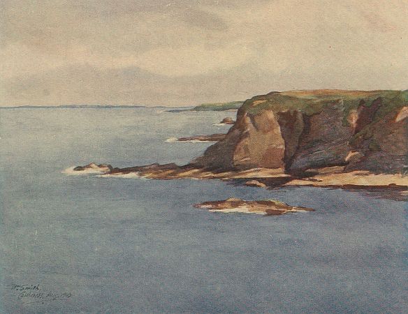 Fishing and fowling, as well as antiquarian puzzles, have long been attractions to these rocks and waters, that begin to be more visited for their own sake, now that our generation develops a taste in out-of-the-way aspects of nature. It was a lucky hit for the archipelago when in 1814 Walter Scott accompanied the Northern Lights Commissioners on their jovial tour of office, at Stromness picking up from a toothless Norna that story of the pirate Gow which he so well dressed up in the contents of his note-book. One admires his dexterity in conducting the plot so as to bring in the lions of a trip, his companions on which could have no doubt of the authorship. Gow was a real character, whose name, to be translated Smith, pairs with Paul Jones, another eighteenth-century corsair, of whom it is told that he was scared away from Lerwick by the red flannel petticoats of women marching to market, as the French invaders of Pembrokeshire were by red-cloaked Welshwomen, mistaken for an army of soldiers. It seems strange to remember how Scott’s fellow-tourists were kept on the alert by the fear of American privateers.
