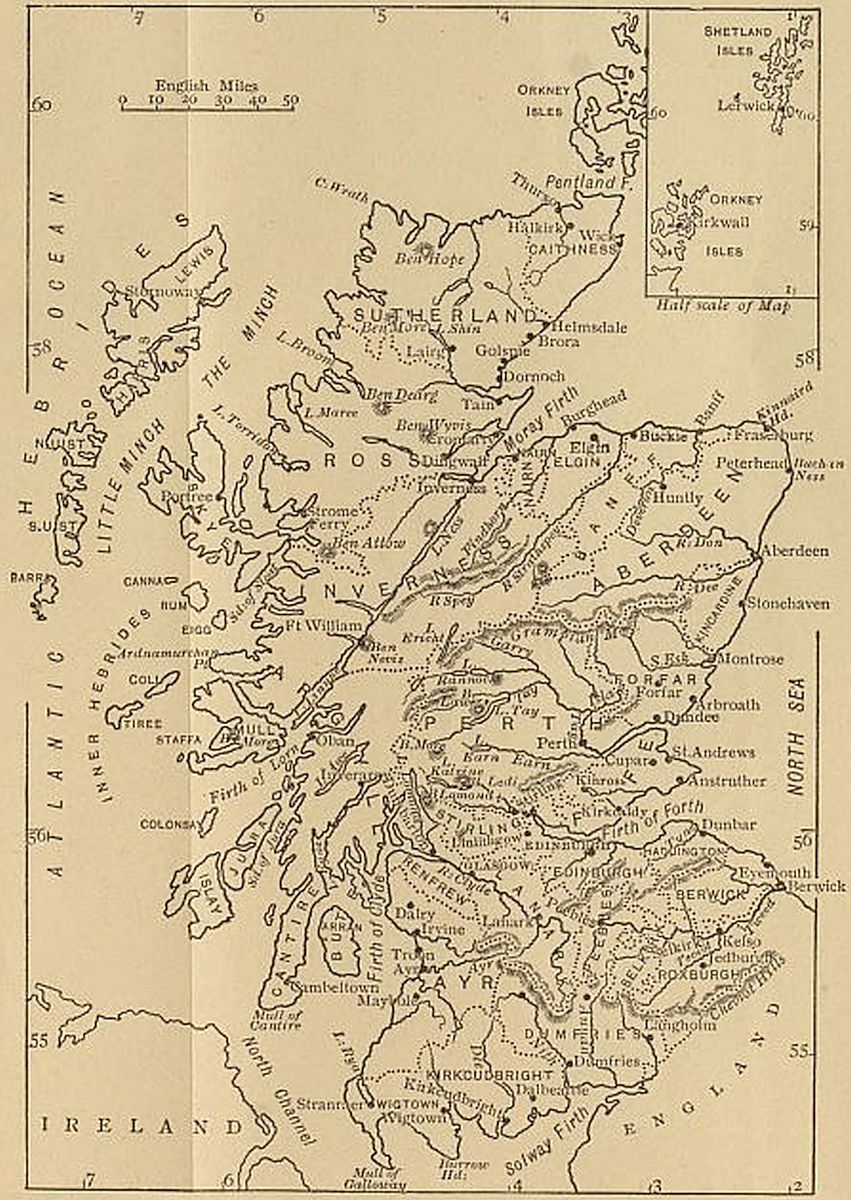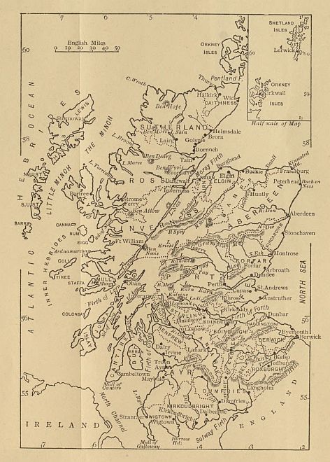 The Orkney and Shetland Isles, whoever were their original inhabitants, became restocked from the kingdom that figures in legendary history as “Lochlin,” and still plainly keep much of the Scandinavian character, on other coasts of Britain appearing only in patches and strains, or, as in the Southern Hebrides, overlaid by Celtic features. These “Nordereys” had early been known to Gothic pirates, crushing the nascent Christianity believed to have been planted by Cormac and other disciples of St. Columba, ghostly fathers whose memory seems to survive in the Papas of the archipelago. [196]The Norwegian kingdom, converted in turn, established its power more or less firmly all over the Hebrides, with occasional assaults on Ireland and Scotland; and for three centuries the Orkneys made a Jarldom dependent on Norway. The Icelandic sagas throw a weird light on their confused history of feuds, treacheries, fire and sword, bouts of drinking and devotion, from which, as the kingdom of Scotland took shape, begins to emerge a contention between relationships of kindred and of vicinity. The quasi-independent Jarls of Orkney fitfully recognised a suzerain in Scotland as well as in Norway. At one time we find this Norwegian Nizam seated across the Pentland as Thane of Caithness; then again a Scottish earl is imposed on the Orkneys. The position of Shetland is more obscure at this period, but till well on in the middle ages all the Hebrides belonged to the archiepiscopal diocese of Trondhjem.