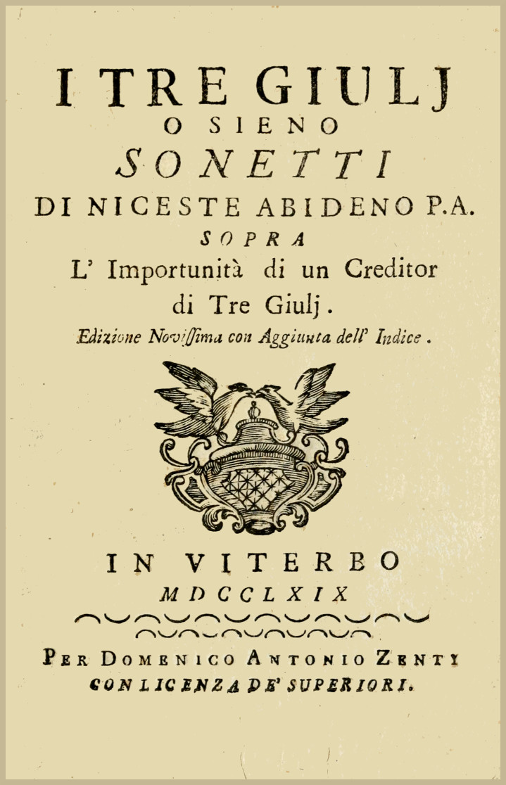 Noi infrascritti specialmente Deputati avendo riveduto un Volume Intitolato: I tre giulj, o sieno Sonetti &c. di Niceste Abidéno P. A. giudichiamo, che l'Autore possa valersi nell'impressione di esso del Nome Pastorale, e dell'insegna dei nostro Comune.