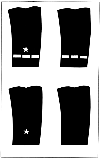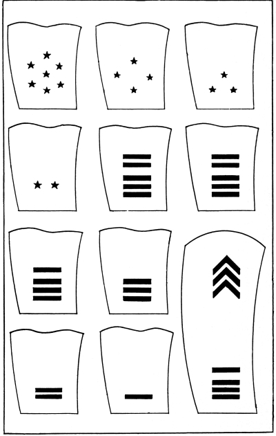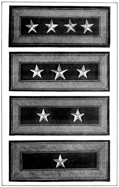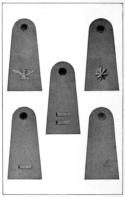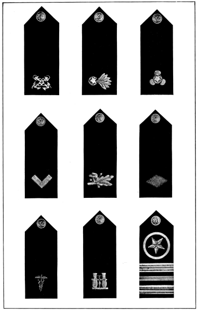 In the United States Army and Marine Corps the prevalent color for the field service uniforms is some shade of the dull brown commonly known as “khaki,” and the bright gilt and silver buttons, corps and regimental devices and numbers and belt buckles have been replaced to a great extent by dull bronze buttons and ornaments, insignia of rank for officers only being still made of silver and gold. [Pg 12]
