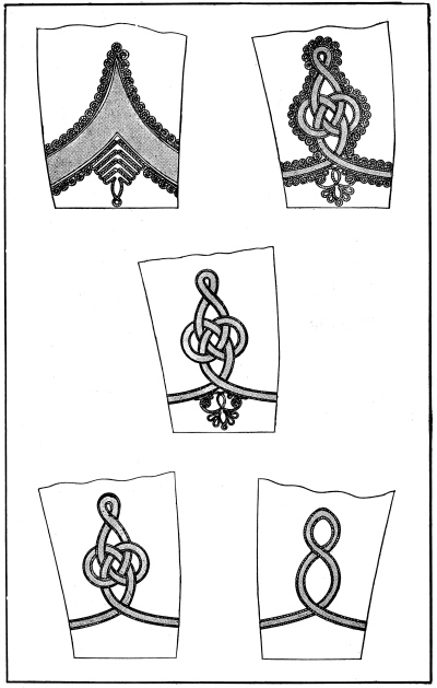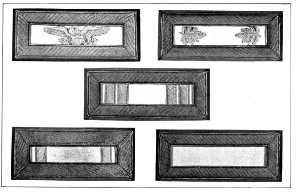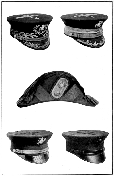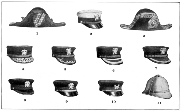 Cords of various colors were worn around the base of the crown of the “slouch hat” when it was first adopted, and for ornamentation these cords had tassels at the ends, while the different colors of the hat cords indicated the regiment, corps or service of the wearer. These [Pg 4] cords in various colors, depending upon the service or corps of the wearer, are now worn on the field hats of officers and men in the United States Army and Marine Corps, as described later in this book, and the tradition of the hat cord tassels is still kept in the cocked hat of the naval officer by the gold bullion tassels at the front and rear peaks. Likewise the influence of the original loop strap and button for fastening up the brim of the original “slouch hat” is seen in the United States naval officer’s cocked hat in the shape of the gold lace strap and gilt button on the side of the crown.
