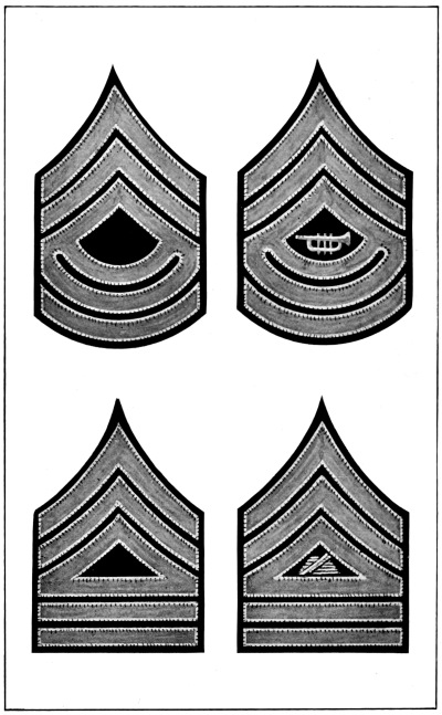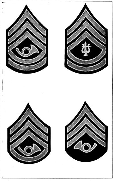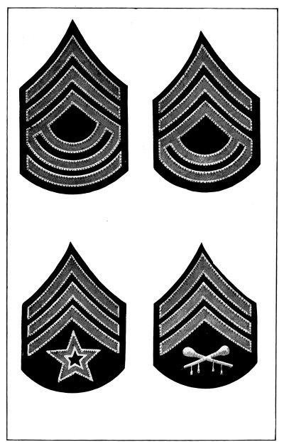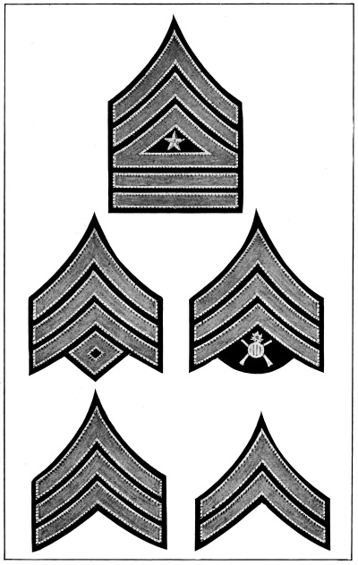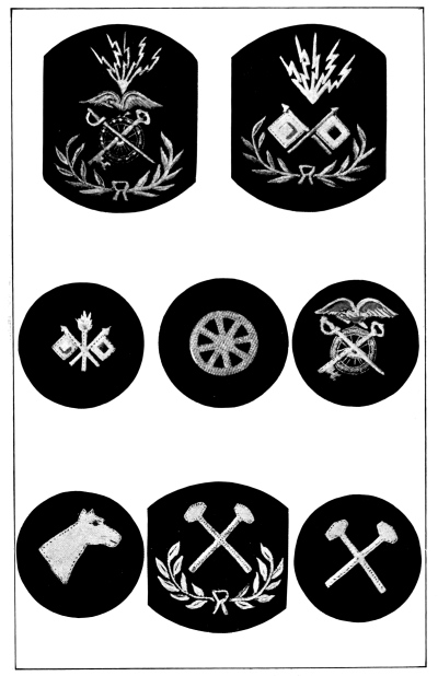 The Army is divided into various arms or corps according to the duties required, as follows: infantry, cavalry, field artillery, coast artillery corps, engineer corps, signal corps including aviation section, quartermaster corps, ordnance corps, judge advocate’s corps, inspector general’s corps and medical corps. Each of these arms or corps has a distinctive badge to be worn on all uniforms and a distinctive color for the facings and trimmings of dress uniforms, as described and illustrated in Chapter IV.