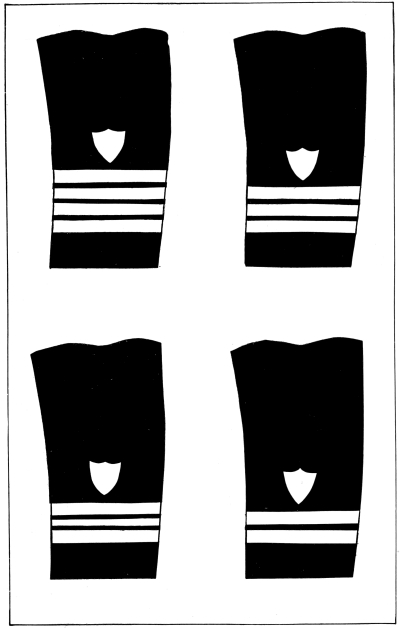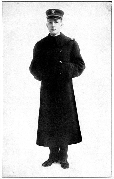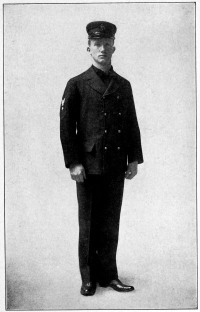 Thus it came about that the accepted sailor uniform consisted of easy fitting garments suited to the work of hauling on the ropes, working aloft on the rigging, masts and spars of the sailing ships and pulling at the oars of the small boats. From this beginning came the sailor uniform of to-day, the bell-mouthed trousers that could be rolled up quickly and easily when the barefooted sailors washed down the decks, the easy-fitting, loose-necked shirt or “jumper,” the short overcoat or “peacoat” for winter wear, and the loose-topped, brimless cap which to give it a smarter appearance when going ashore “on liberty” (the sailor term for leave of absence) was provided with a light ring or “grommet” to stretch the crown out flat, resulting in the common sailor “flat-hat” of to-day.