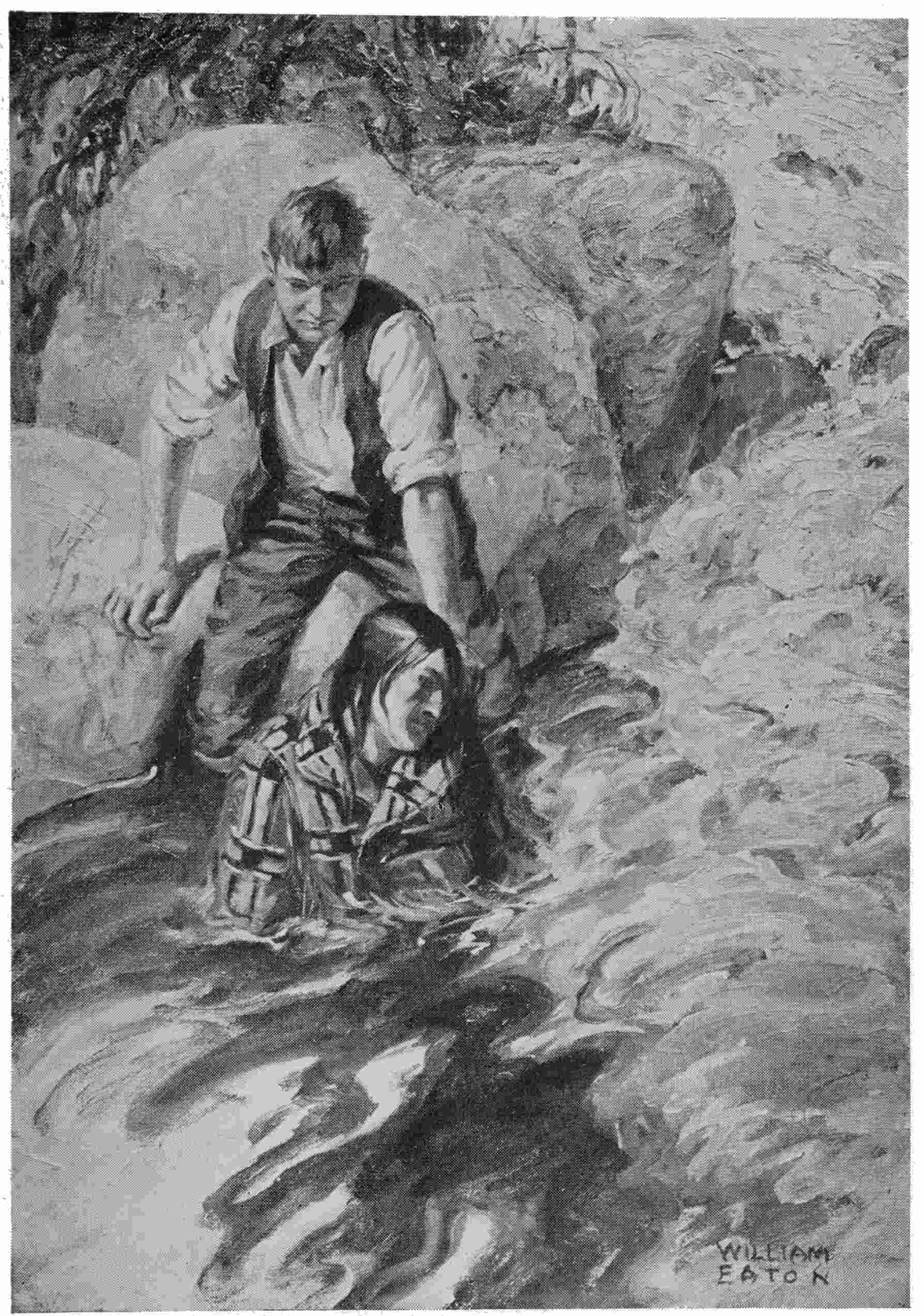 It was rough, breathless paddling, though they hugged the shelter of the shore as much as possible. They made slow time on that stage of the journey, but when they reached the river things went more easily. The river ran swiftly and was rather shallow now, but there was always plenty of water for the canoe, and the faster the current the better. Down the stream they shot, past the old trail to Uncle Phil’s ranch, around the wide curves bordered by the incessant green of the spruces, silently and swiftly, with a speed that filled Tom with renewed hope. He was in fine physical condition; the hour’s rest had restored him, and the rough and sleepless night behind him had left only a nervous tension that for the time being actually stimulated his sinews.