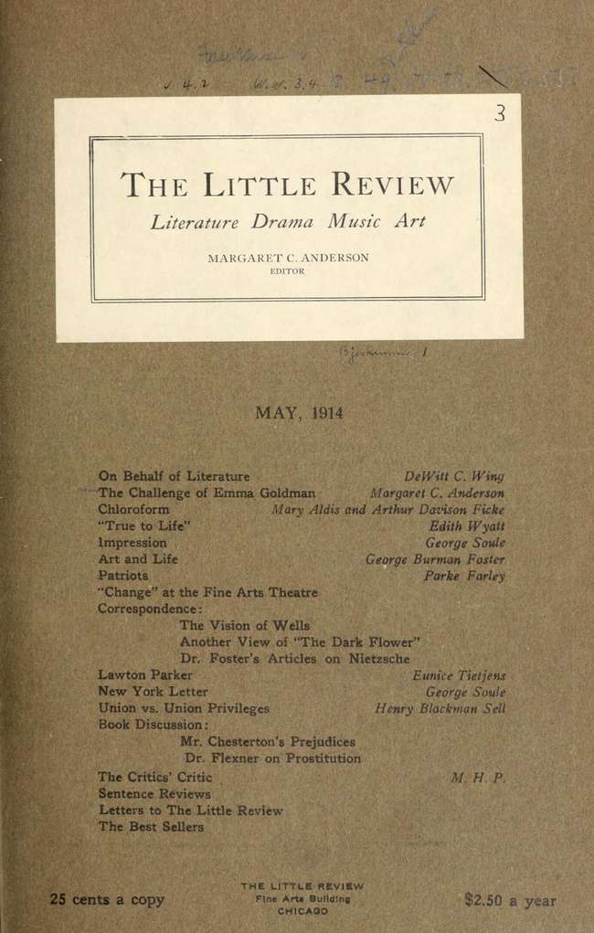 Project Gutenberg's The Little Review, May 1914 (Vol. 1., No. 3), by Various This eBook is for the use of anyone anywhere in the United States and most other parts of the world at no cost and with almost no restrictions whatsoever. You may copy it, give it away or re-use it under the terms of the Project Gutenberg License included with this eBook or online at www.gutenberg.org. If you are not located in the United States, you'll have to check the laws of the country where you are located before using this ebook. Title: The Little Review, May 1914 (Vol. 1., No. 3) Author: Various Editor: Margaret C. Anderson Release Date: August 18, 2020 [EBook #62966] Language: English Character set encoding: ISO-8859-1 *** START OF THIS PROJECT GUTENBERG EBOOK THE LITTLE REVIEW, MAY 1914 *** Produced by Jens Sadowski and the Online Distributed Proofreading Team at http://www.pgdp.net. This book was produced from images made available by the Modernist Journal Project, Brown and Tulsa Universities, http://www.modjourn.org.