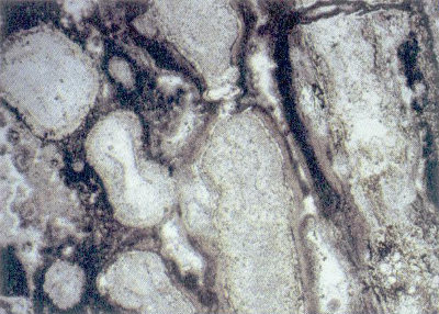 Microscopic cross section of rhyolitic rock. Cross sections show vastly different textures. Rhyolitic magma contains more silica; it is very thick and does not allow trapped gas to escape easily. Its volcanic eruptions blast large craters in the Earth’s crust. Basaltic magma is more fluid and allows gas to escape readily. It erupts more gently. Here in the eastern Snake River Plain, basaltic lava flows almost completely cover earlier rhyolitic deposits.
