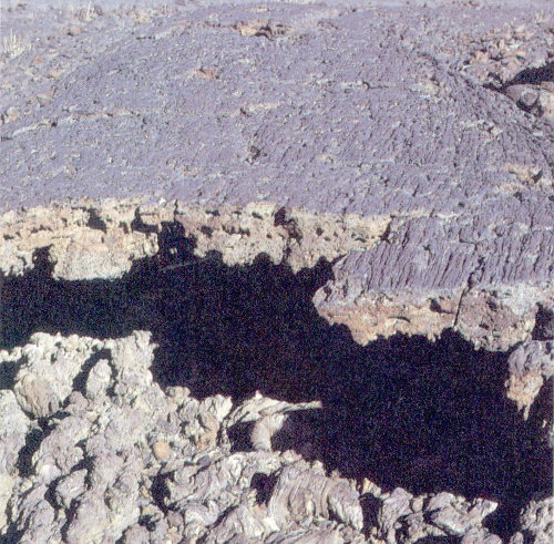 Indian Tunnel looks like a cave, but it is a lava tube. When a pahoehoe lava flow is exposed to the air, its surface begins to cool and harden. A crust or skin develops. As the flow moves away from its source, the crust thickens and forms an insulating barrier between cool air and molten material in the flow’s interior. A rigid roof now exists over the stream of lava whose molten core moves forward at a steady pace. As the flow of lava from the source vent is depleted, the level of lava within the molten core gradually begins to drop. The flowing interior then pulls away from the hardening roof above and slowly drains away and out. The roof and last remnants of the lava river inside it cool and harden, leaving a tube.