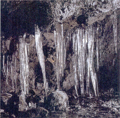 Stalactites Dripped from hot ceilings, lava forms stalactites that hang from above. Mineral deposits Sulfate compounds formed on many lava tube ceilings from volcanic gases or by evaporation of matter leached from rocks above. Ice In spring, ice stalactites form on cave ceilings and walls. Ice stalagmites form on the cave floor. Summer heat destroys these features. Wildlife Lava tube beetles, bushy-tailed woodrats (packrats), and bats live in some dark caves. Violet-green swallows, great horned owls, and ravens may use wall cracks and shelves of well-lit caves for nesting sites.