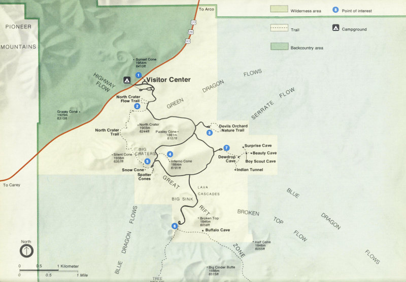 You can see most of the features for which Craters of the Moon is famous by a combined auto and foot tour along the Loop Drive. With several short walks included, you can make the drive in about two hours. Numbered stops are keyed to the map in the park folder.