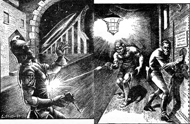 Fully expecting official papers, signed and garnished with all the pompous seals of a chartered metropolis, the guard was dazed to receive instead a terrific left-handed foul to the pit of the stomach, and as he reeled dizzily, retching and clawing for his gun, to find that gun no longer holstered but in the hand of the self-styled Poligerent, pointing at its licensed owner.