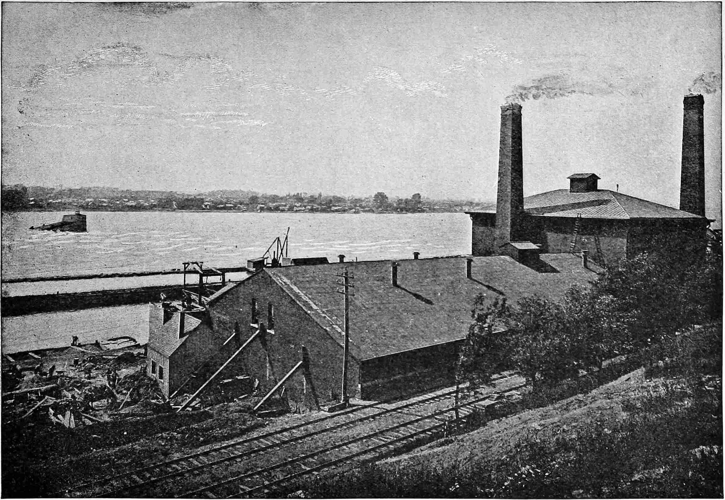 WATERWORKS POWER HOUSE AND INLET PIER IN NIAGARA RIVER.
