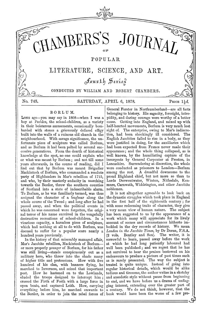Long ago—you may say in 1808—when I was a boy at Peebles, the school-children, as a variety in their boisterous amusements, occasionally bombarded with stones a grievously defaced effigy built into the walls of a ruinous old church in the neighbourhood. With savage significance, the unfortunate piece of sculpture was called Borlum, and as Borlum it had been pelted by several successive generations. From the dearth of historical knowledge at the spot, no one could explain who or what was meant by Borlum; and not till some years afterwards, in the course of reading, did I find out that by Borlum was meant Brigadier Mackintosh of Borlum, who commanded a resolute party of Highlanders in Mar’s rebellion of 1715, and who, by their masterly audacity in marching towards the Border, threw the southern counties of Scotland into a state of indescribable alarm. To Borlum, as he was familiarly termed, was thus assigned the character of a bugbear along the whole course of the Tweed; and long after he had passed away, and when the political events in which he was concerned were forgotten, the original terror of his name survived in the vengefully destructive recreations of school-children. In a vicarious capacity, a harmless piece of sculpture, which had nothing at all to do with Borlum, was doomed to suffer for a popular scare nearly a hundred years previously.