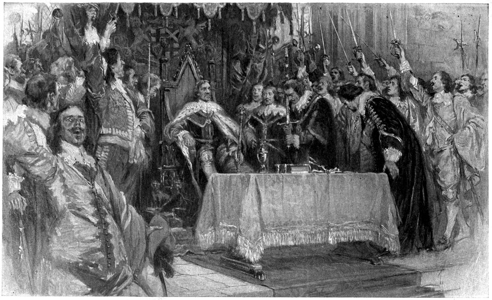 187They reckoned without their host. Cromwell, sitting in his reception-room, and waiting the return of the conferees of last evening, learned what was going on, and just as he was clad, “in plain black clothes and gray worsted stockings,” followed by a few officers and twenty or thirty stark musketeers, he walked down to the House. There he sat and listened for some time to the debate on the Bill, once beckoning over Harrison, the Republican general, his devoted follower. When the question was put as to whether the Bill should pass, he rose and broke in with one of his characteristic speeches. First, he enumerated the good that had been done by Parliament, and then began to tell them of their injustice, their heed to their own self-interests, their delay to do right. One among his eager listeners called him to order, but no appeal to Parliamentary forms could save the doomed House. “Come, come!” answered Oliver, “we have had enough of this; I will put an end to your prating!” With that he clapped on his hat, stamped on the floor with his feet, and began to rate the Commons as if they were disobedient school-boys. “It is not fit that you should sit here any longer; you have sat too long for any good that you have been doing lately; you shall now give place to better men!” And Harrison called in the musketeers. Oliver then continued, enumerating the sins of the members, some of whom were drunkards, some lewd livers, some corrupt and unjust. The house was on its feet as he lifted the mace, saying: “What shall we do with this bauble? Take it away!” and gave it to a musketeer; and then, turning toward the Speaker: “Fetch him down!” and fetched down he was. Gloomily the members went out, while Cromwell taunted Sir Harry Vane with breaking his promise, ending with: “The Lord deliver me from thee, Sir Harry Vane!” So ended the Long Parliament and, asserted Oliver, “We did not hear a dog bark at their going.”