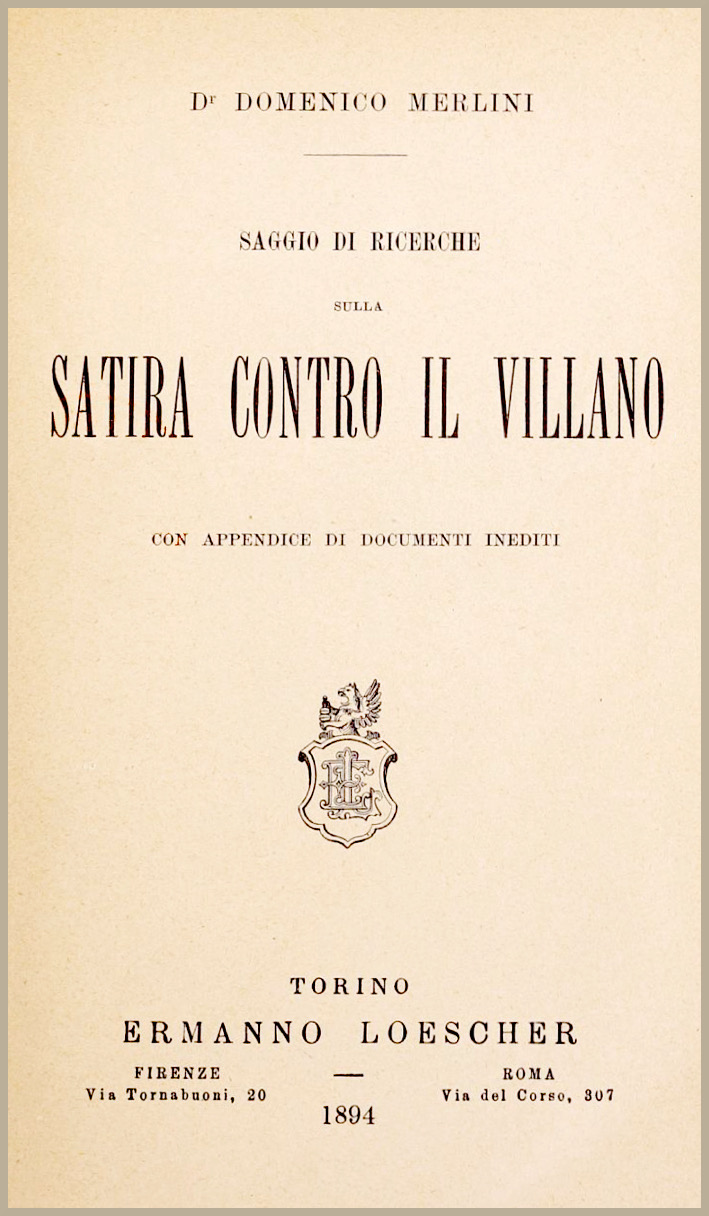 Lo studio che noi presentiamo al cortese Lettore vuol essere considerato come un semplice contributo e un modesto saggio sopra un argomento di tanta importanza, quale è quello da noi trattato; questo desideriamo di dichiarare esplicitamente, perchè non ci si incolpi di temerarietà, per aver voluto costringere in una piccola cornice una ricerca che presenta tanto interesse per la nostra storia letteraria. Sopratutto abbiamo cercato di affrontare la questione tanto intricata delle origini della Satira contro il Villano, e ci siamo sforzati di mettere in chiaro i non dubbi legami che esistono tra le ultime esplicazioni di questa Satira e il sorgere di una delle principali maschere della Commedia dell'Arte. Abbiamo inoltre cercato di curare colla massima diligenza, fin dove ci fu possibile, la riproduzione dei documenti inediti o rari che abbiamo riunito nell'Appendice.