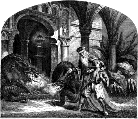 Végre egy finom smaragd-palotához értek, mely széles árkokkal vétetett körül, s a melynek partján bizonyos távolságra egymástól oly magas fák állottak, hogy árnyékuk az egész palotát elfödözé. Az ajtóval általellenben, mely merő arany vala, egy híd volt egyetlen egy halpaizsból; noha legalább is hat ölnyi hosszu s három ölnyi széles vala. Elől a hidnál egy sereg iszonyu nagyságu szellemeket lehetett látni, kik a vár kapuját vastag sinai aczél buzogányokkal védték.