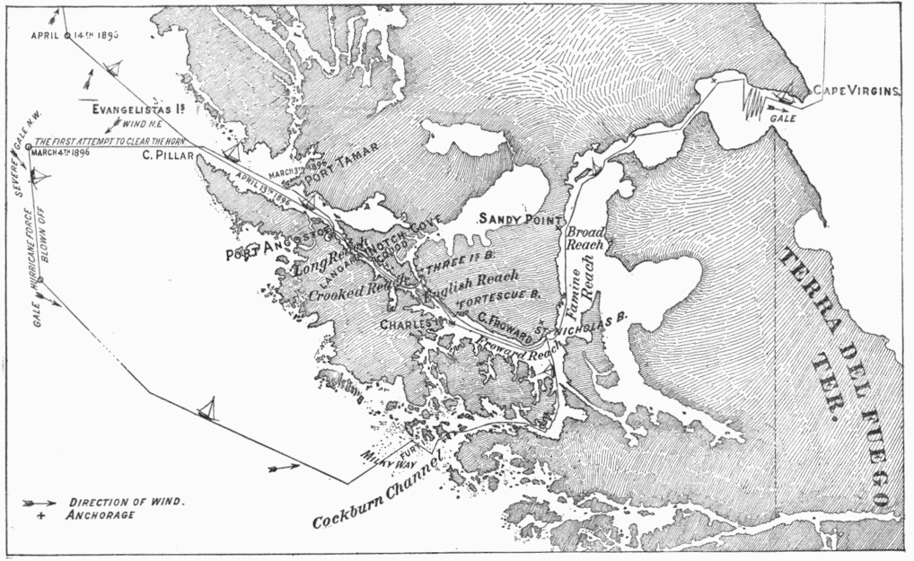 From Cape Pillar into the Pacific—Driven by a tempest toward Cape Horn—Captain Slocum's greatest sea adventure—Reaching the strait again by way of Cockburn Channel—Some savages find the carpet-tacks—Danger from firebrands—A series of fierce williwaws—Again sailing westward.