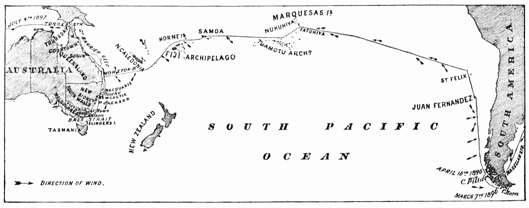 Seventy-two days without a port—Whales and birds—A peep into the Spray's galley—Flying-fish for breakfast—A welcome at Apia—A visit from Mrs. Robert Louis Stevenson—At Vailima—Samoan hospitality—Arrested for fast riding—An amusing merry-go-round—Teachers and pupils of Papauta College—At the mercy of sea-nymphs.