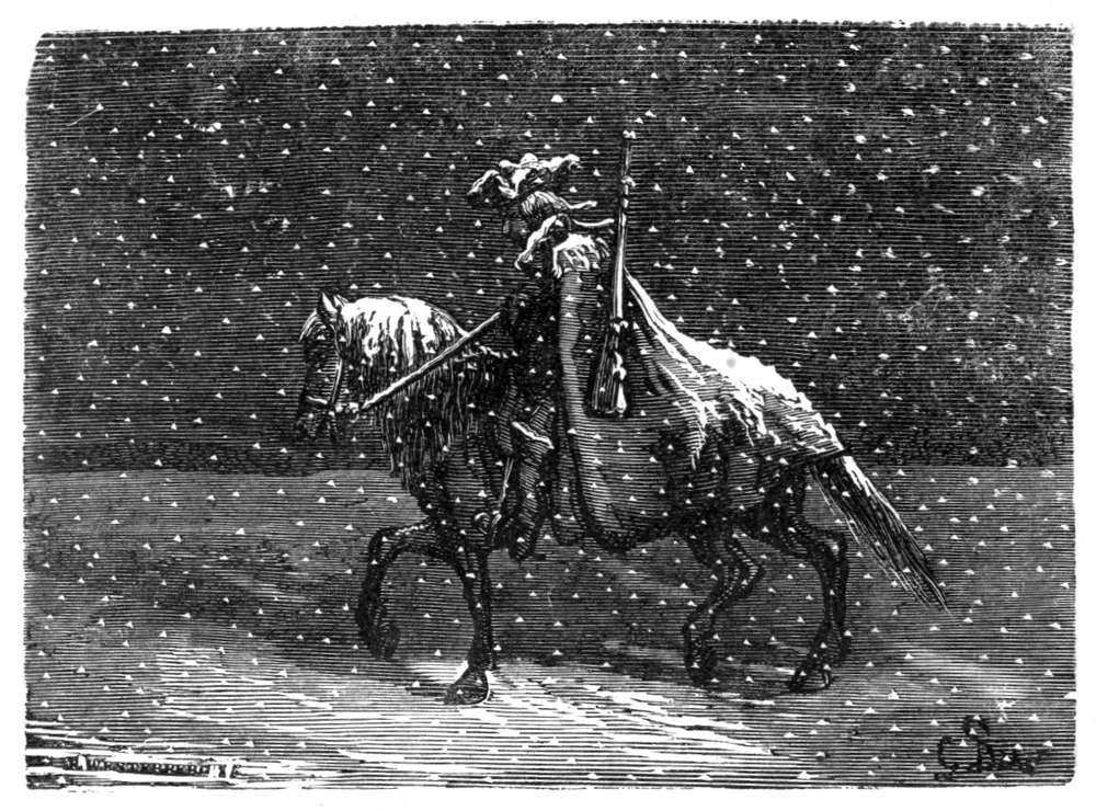 Da jeg var meget træt, steg jeg av hesten og bandt den til en spids stolpe som rak over sneen. For sikkerhets skyld la jeg mine pistoler under hodet, strakte mig saa lang jeg var og faldt straks i dyp søvn. Jeg vaagnet ikke før solen stod høit paa himlen.