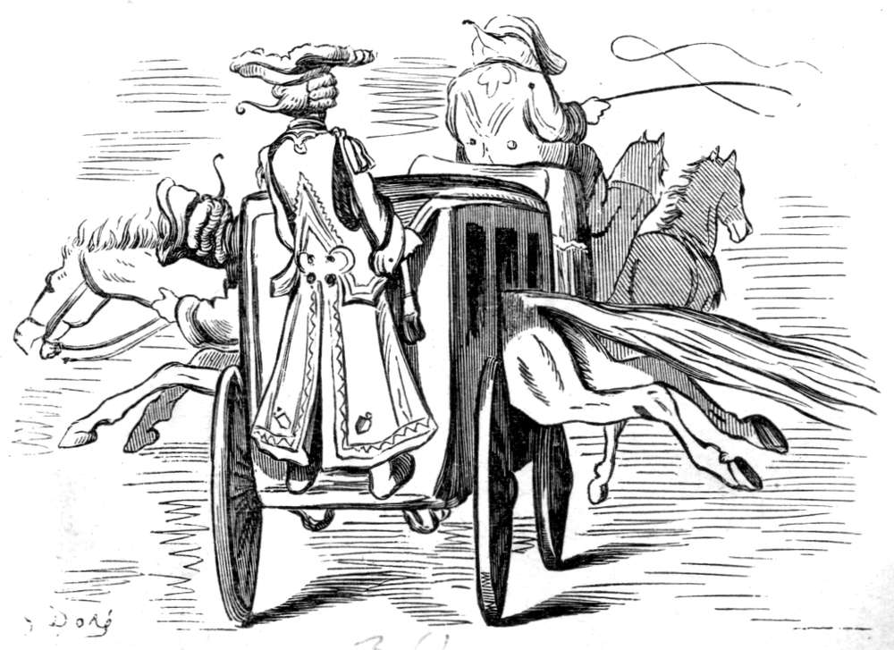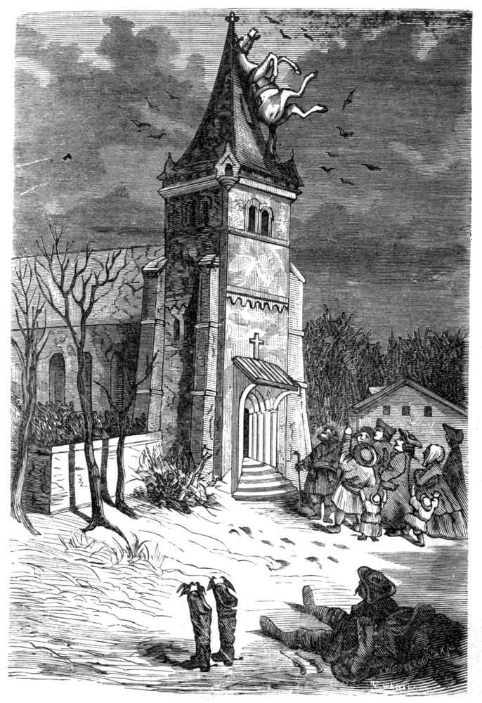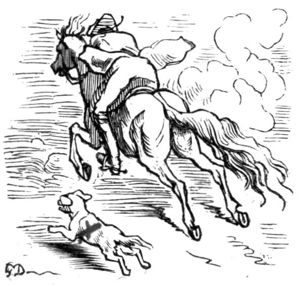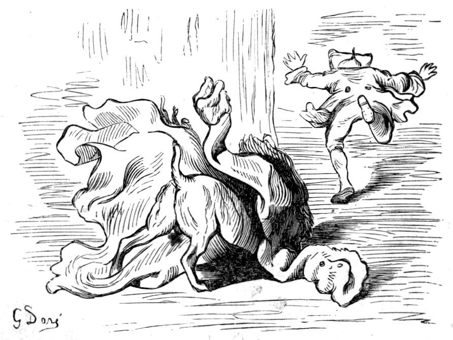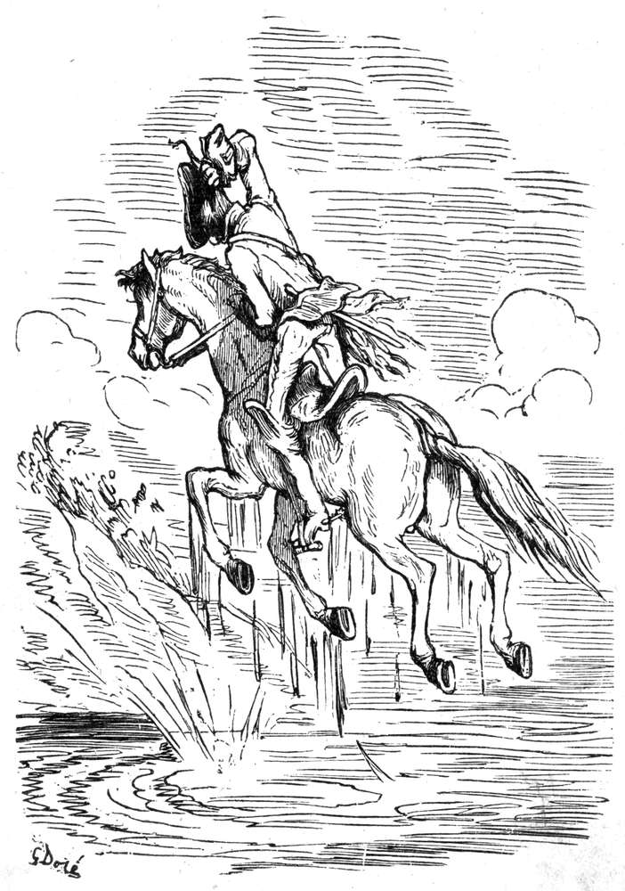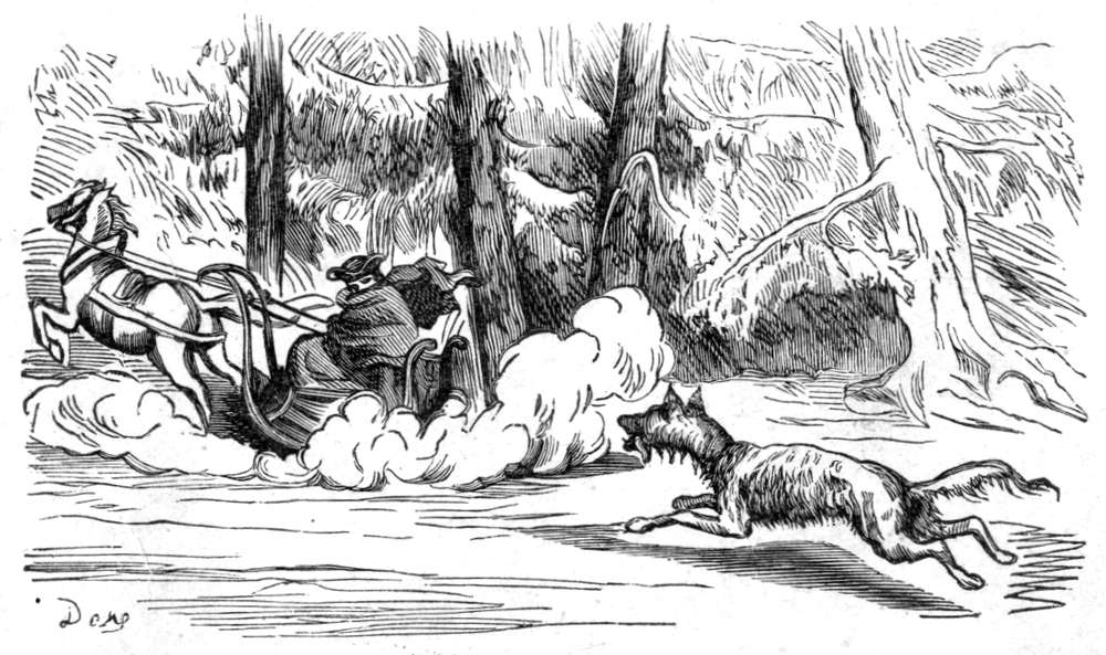 Det var ingen utsigt for mig til at slippe fra den, hvorfor jeg la mig ned paa bunden av slæden og lot min forskrækkede hest løpe for livet. Da skede det som jeg hadde ønsket, men neppe hadde turdet haabe. Ulven brød sig ikke det mindste om min ringe person, men satte over mig og anfaldt med raseri hesten, hvis bakdel den øieblikkelig sønderslet og slukte med graadighet. Det arme dyr for i sin skræk og smerte avsted i frygtelig fart. Da jeg saaledes selv var utenfor fare for øieblikket, vovet jeg at løfte hodet og saa med skræk, at ulven næsten hadde ætt sig ind i hestens krop. Det varte ikke længe før den var dypt inde i hestens legeme; men da pisket jeg av alle kræfter paa den bakfra, saa den forvirret skyndte sig at æte sig forover, indtil tilslut hestens kadaver faldt ned paa jorden. I stedet hadde jeg nu faat ulven i sælen, og da jeg brukte pisken saa flittig som jeg kunde, ankom jeg snart mot begges forventning og til tilskuernes høieste forbauselse til St. Petersburg.