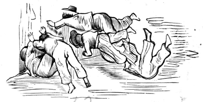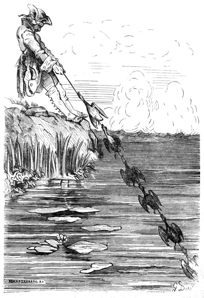 Det var ingen tid at spilde. Jeg hadde aandsnærværelse nok til at huske paa det gode fyrtøi, jeg hadde i mine øine, hvorfor jeg aapnet panden, sigtet paa fuglene og slog saa av alle kræfter med knyttet næve til mit ene øie. (Baronens øine har bestandig været usedvanlig ildfulde og de tindrer især, naar han fortæller denne historie). Gnister i mængdevis for ut, fængkruttet tændtes, skuddet gik av, og jeg skjøt med et skud 50 vildænder, 25 stokænder og 3 krikænder.