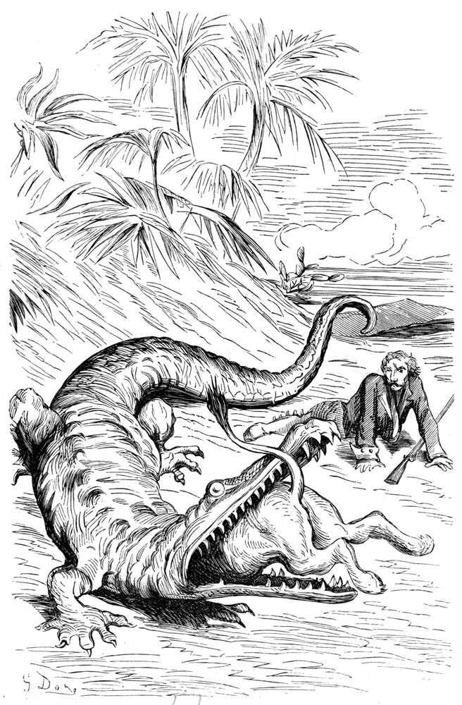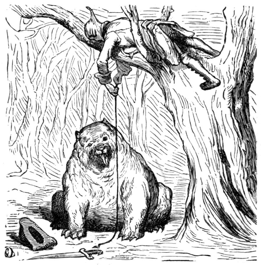 Vort første ønske da vi var kommet ut, var at faa vite, hvor i verden vi befandt os. Det varte en god stund før vi kom til visshet om dette. Tilsidst opdaget jeg ved hjælp av nogen tidligere iagttagelser at vi fandt os i det Kaspiske hav. Da dette jo paa alle sider er omgit av land og ikke staar i forbindelse med havet ved nogen elv, kunde vi ikke forstaa hvordan vi var kommet dit. En indbygger av osteøen, som vi hadde tat med, forklarte saken paa en maate som ser høist sandsynlig ut. Efter hans mening hadde uhyret naadd sjøen gjennem en underjordisk kanal. La det nu være som det vil, der var vi, og meget lykkelige var vi ved at befinde os der. Vi satte alle seil til og naadde snart land. Jeg var den første som steg iland, men neppe hadde jeg sat foten paa stranden før jeg blev angrepet av en uhyre bjørn.